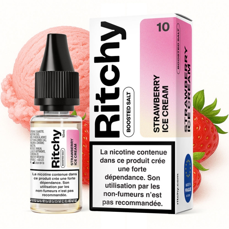 Ανακαλύψτε το Ritchy Strawberry Ice Cream με άλατα νικοτίνης, μια κρεμώδη και φρουτώδη απόλαυση που συνδυάζει τη γλυκύτητα της φράουλας με τη βελούδινη υφή του παγωτού. Περιεκτικότητα: 10 ml. Αναλογία PG/VG: 50/50. Διαθέσιμο σε διάφορα επίπεδα νικοτίνης.
