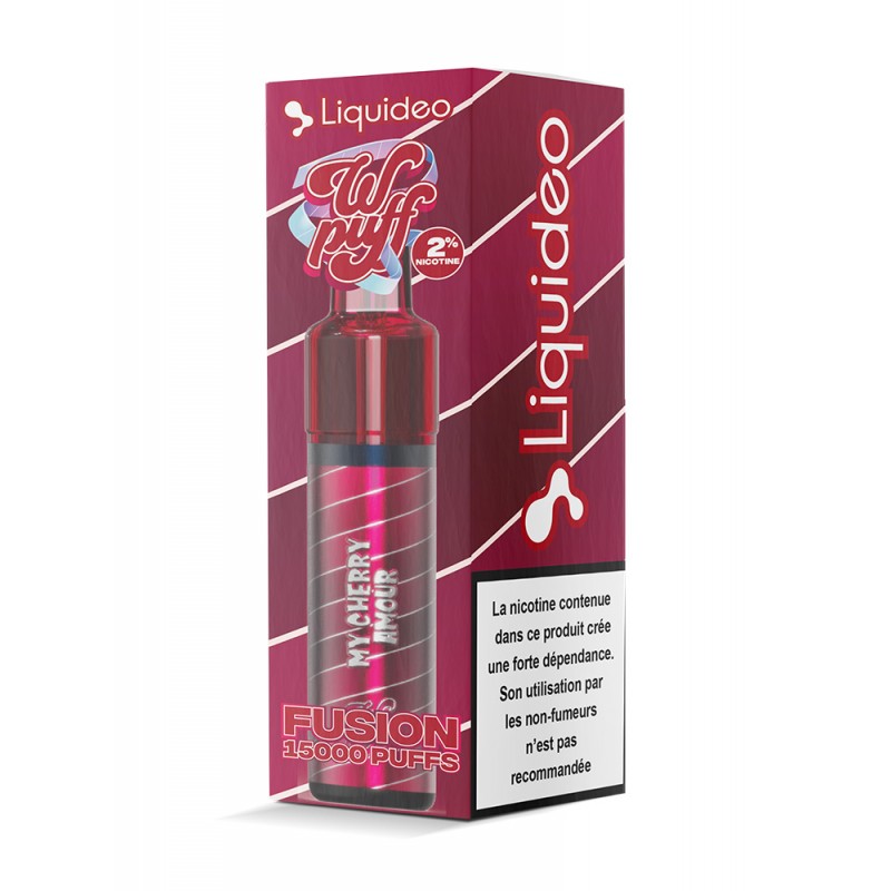 Wpuff Fusion My Cherry Amour is a rechargeable e-cigarette by Liquideo with a delicate cherry flavor. The kit includes a replaceable 2 ml cartridge and a 10 ml e-liquid bottle, providing up to 15 000 puffs. The device features a 1750 mAh battery and USB-C charging.
