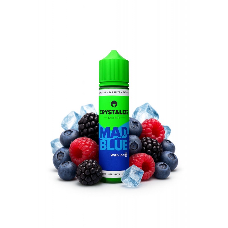 Ontdek Long-Fill Aroma Mad Blue Ice van Crystalize: een intense mix van bosbes, braam en framboos, verrijkt met een verfrissend ijseffect. Perfect voor liefhebbers van sappige en verkwikkende smaken.