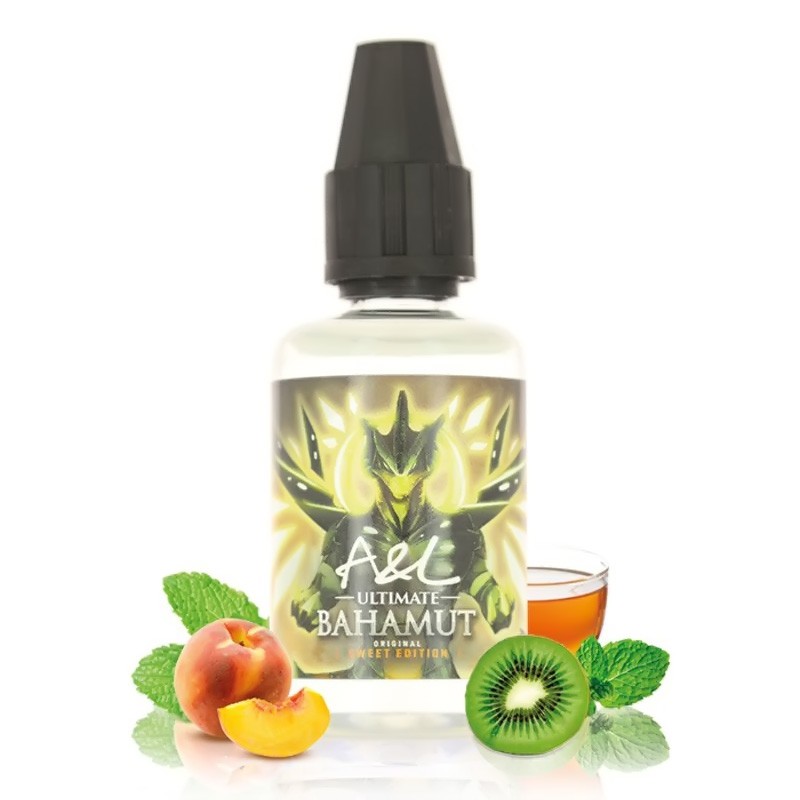 Aroma concentrado Bahamut Ultimate 30 ml - A&L combina a doçura do pêssego com o sabor exótico do kiwi, aprimorados por um toque sutil de menta. Ideal para quem busca criar e-líquidos DIY frutados e equilibrados, perfeitos para o uso diário.